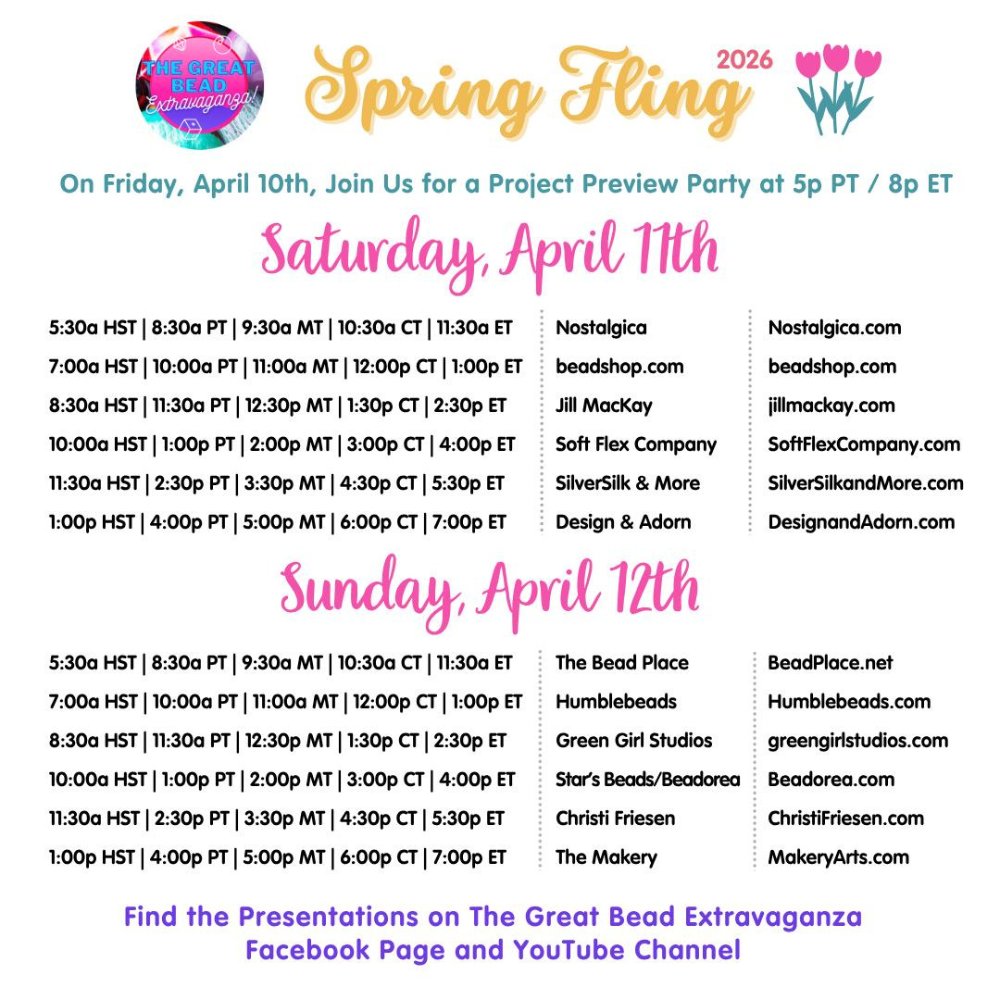 Soft Flex Company's Spring Fling presentation will be live on April 11th at 1pm PT. Check it out live on The Great Bead Extravaganza Facebook page and YouTube channel.