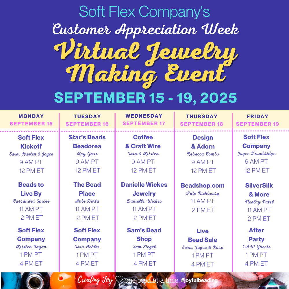 Customer Appreciation Week, hosted by Soft Flex Company, is a week-long virtual event that takes place live on Soft Flex Company's Facebook Page and YouTube Channel from September 15 - 19, 2025. You will be able to replay all videos any time after. There will be FREE live jewelry making classes all week, just buy the make-along kits from each presenter. We teamed up with bead stores and designers across the country to bring you multiple fun and unique classes each day. We curated this event as a way to say THANK YOU to you, our amazing customers and beading community as well as some of our most loyal bead store customers, who work hard to sell our products.